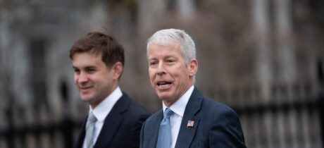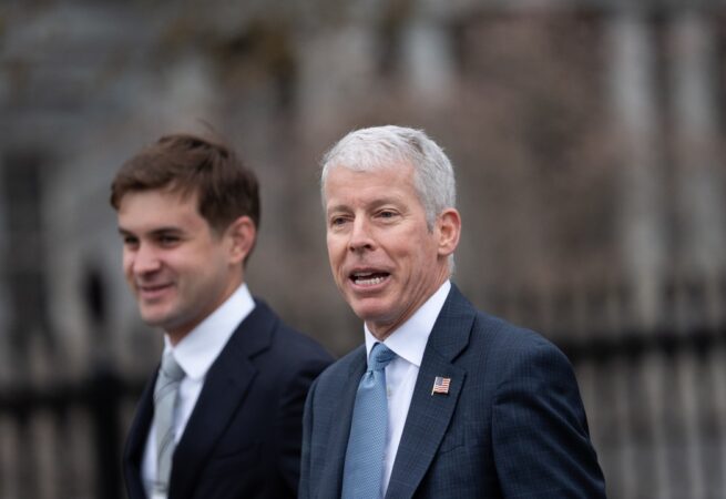 Mike Huckabee, az Egyesült Államok izraeli nagykövete távozott, és a sürgősségi személyzet egy lakóépületre intézett iráni rakétacsapás helyszínén Tel Avivban, Izraelben 2026. március 1-jén. (Alex Brandon/Pool/AFP a Getty Images-en keresztül; Ronen Zvulun/TPX Images of the Day/Reuters)