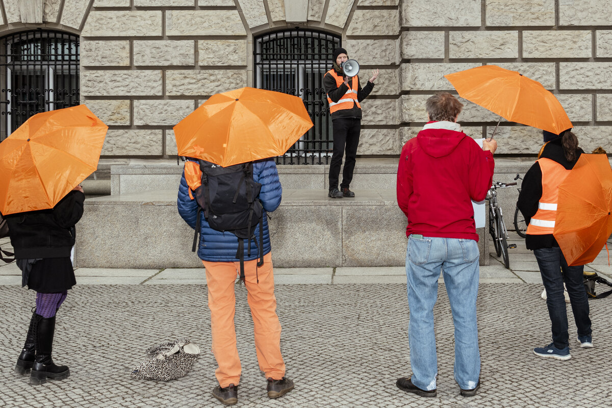 Péntek délután a csoport meg akarta győzni a Bundestag biztonsági személyzetét a „népparlamentek” koncepciójáról, és udvariasan bejutást kértek, de a rendőrök megrázták a fejüket, és intettek. „Szeretnénk megkérni önöket, engedjenek be minket, hogy ezentúl a Bundestagból szervezhessük a népparlamenteket” – áll a jegyzetben, amelyet Jeschke át akart adni a felvételi stábnak.