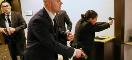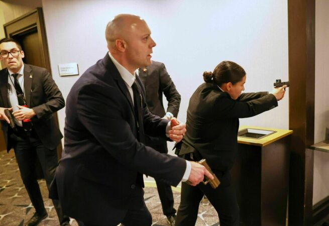 Donald Trump elnököt és más kormányzati tisztviselőket evakuálták a Washington Hilton épületéből, miután 2026. április 25-én, Washingtonban, a Fehér Ház tudósítói szervezetének vacsorája során lövöldözésről érkezett jelentés. (Nathan Howard/Getty Images)