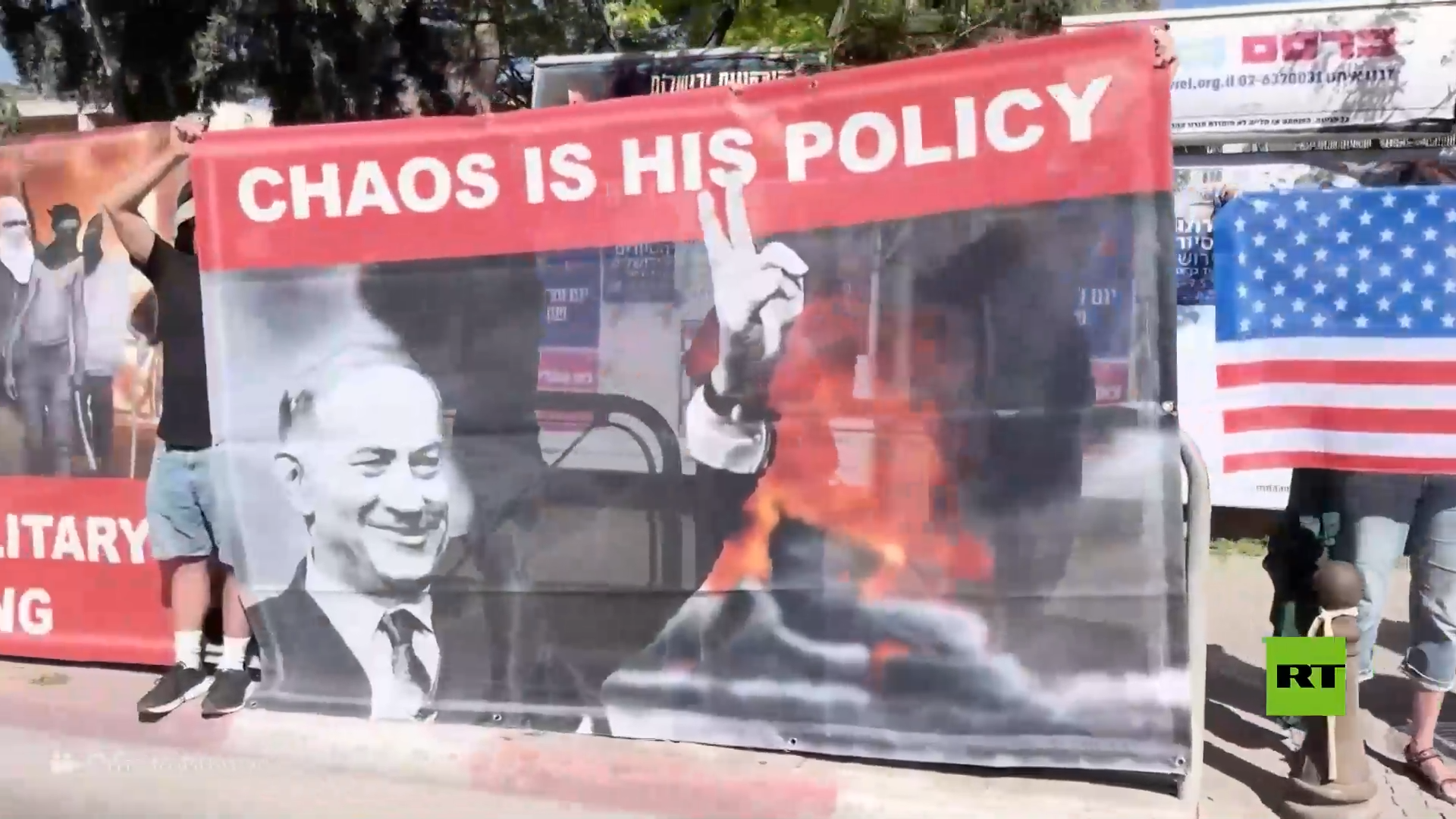 A demonstrálók nagy transzparenseket vittek magukkal Netanjahu képeivel és olyan üzenetekkel, mint „Becsapott téged Gázával és Iránnal kapcsolatban”, „Ne támogass egy gyenge, gyűlölt vesztest” és mások.