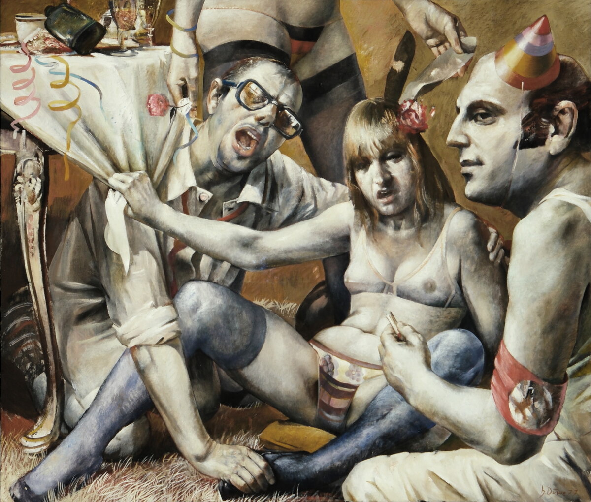 Vagy amikor – hogy a jelenbe ugorjunk – Oska Gutheil színesen robbanékony figuráival találkozunk, mint például Donald Trump fényes, színes Pied Piperként. Vagy a művészetkedvelő mulatozók közössége, akik jóízűen esznek és isznak, miközben a háttérben Picasso „Guernicája” könyörög a figyelemért. Igen, Harald Duwe ma is festhetett volna így.