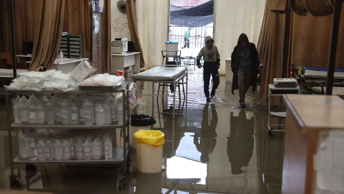 Jelenleg a palesztin menekültek Gázában egyre nehezebb körülmények között néznek szembe, a szélsőséges időjárás és a megfelelő menedék hiánya miatt. Amint a képen látható, ez az állapot súlyosbítja a humanitárius válságot a régióban. Ezen a képen egy palesztin menekült a 2026. március 26-án, a Gázai övezet déli részén fekvő Khan Yunisban heves esőzés után a Nasser Kórházhoz tartozó rögtönzött sátorban lévő víztócsát nézi, amely ambuláns fogadóterületként és sürgősségi osztályként szolgál. (Bashar Taleb/AFP)