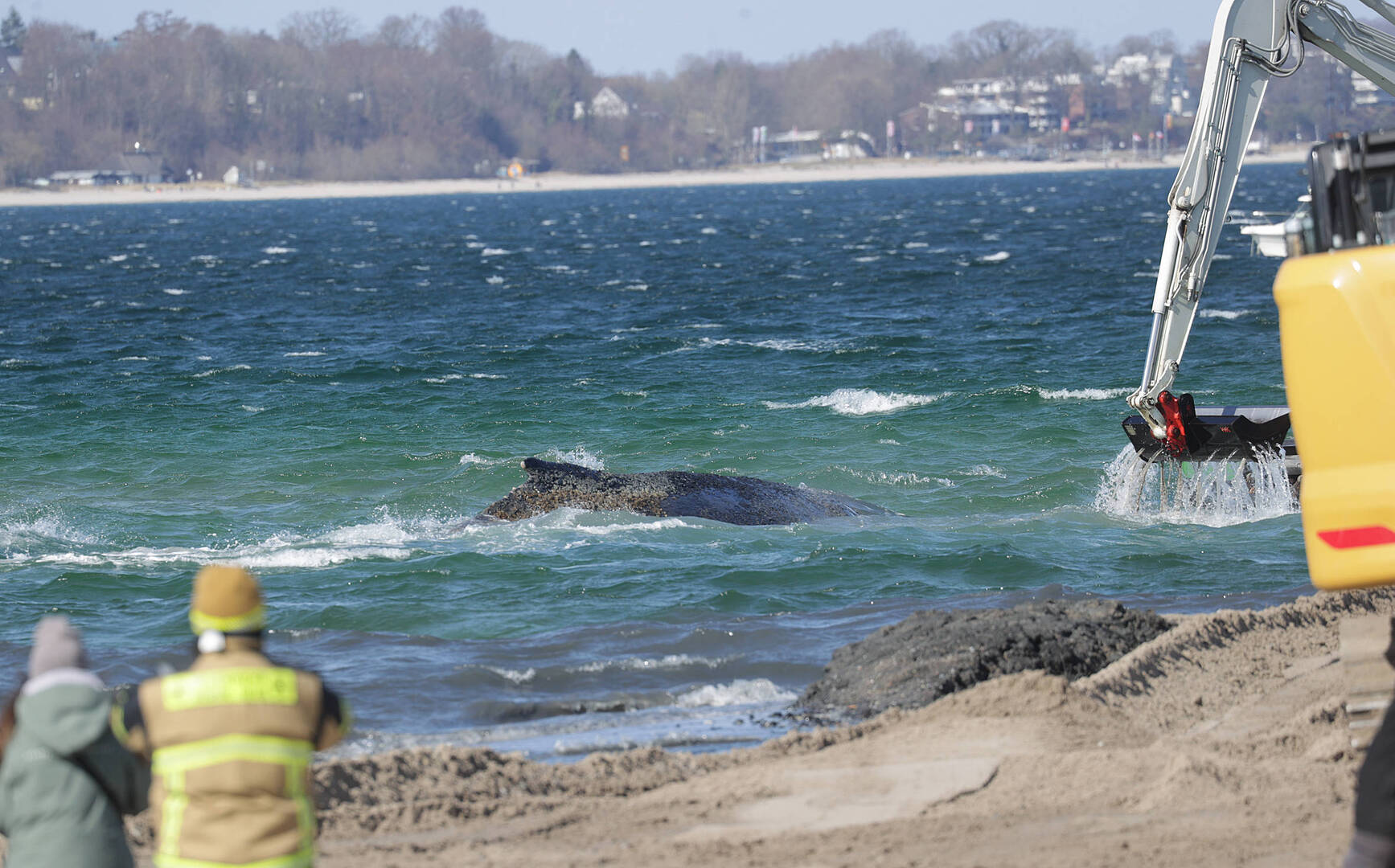 A bálnát múlt hétfőn reggel fedezték fel a homokos tengerparton, majd a következő napokban a mentőcsapat megpróbálta kiszabadítani, de kedden egy kis szívókotróval próbálkoztak kudarcot, mire csütörtökön egy úszó kotrógép ásta ki a vízi utat.