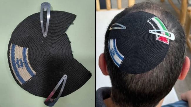 A Jeruzsálemtől harminc kilométerre nyugatra fekvő izraeli Modiin városában a rendőrség letartóztatta a Héber Egyetem egyik oktatóját. Alex Sinclair egy kippa mögül, amelyen Izrael és Palesztina zászlaja volt látható.